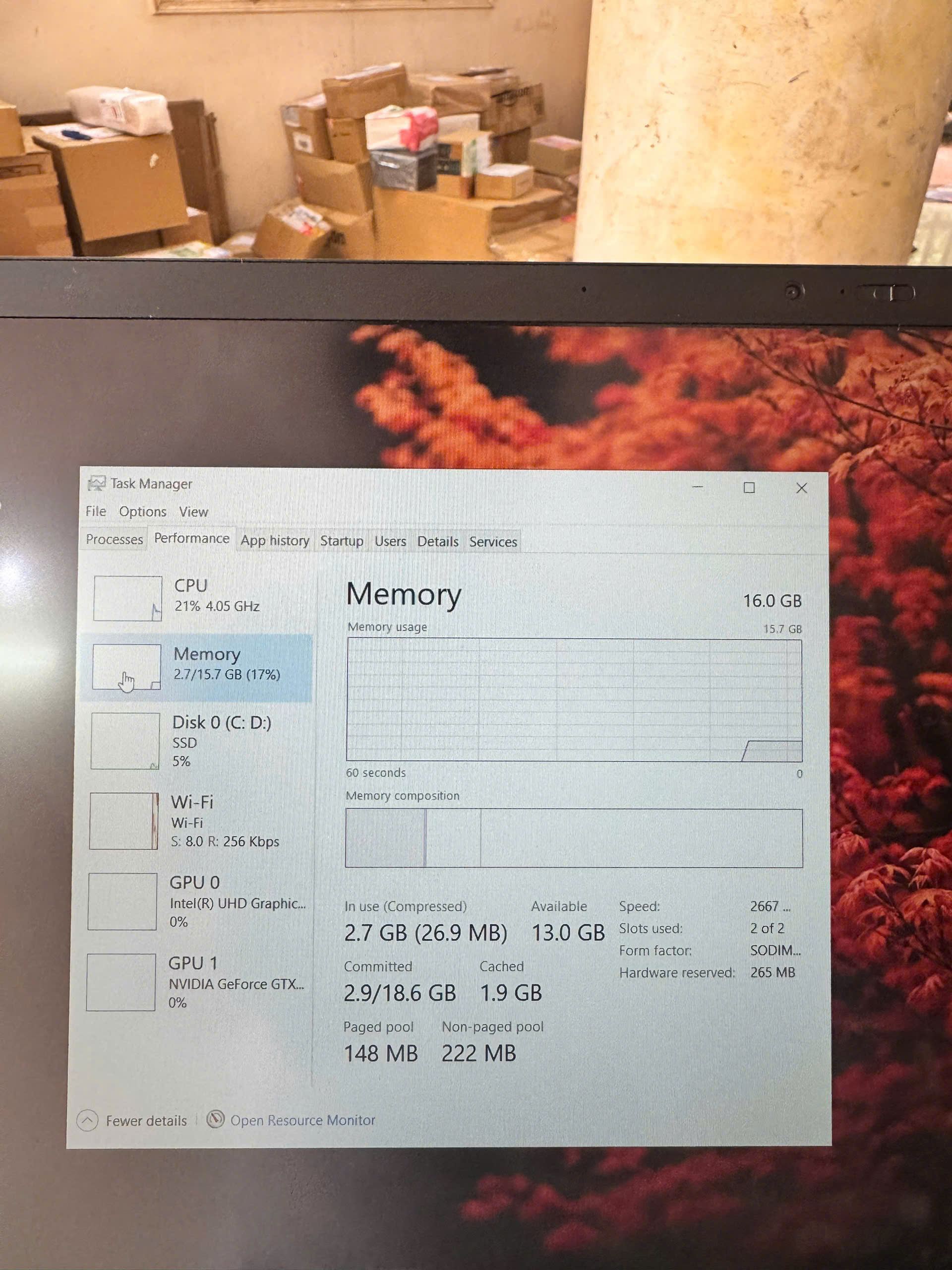 CPU: Intel Core i5-9300H (4 nhân, 8 luồng) – hiệu năng cao, xử lý mượt các tác vụ nặng như render, thiết kế đồ họa, lập trình.